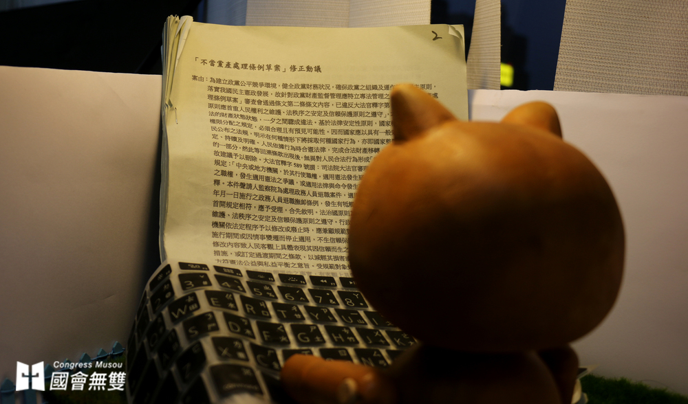 立法院今(22)日加開臨時會處理《不當黨產處理條例》,國民黨黨團再出招,提出總計高達65萬字的修正動議案由,希望藉由宣讀冗長字數來拖延時間。國民黨書記長林德福在受訪時表示,65萬字「全部是助理所寫」還肯定助理辛勞。但《沃草》團隊調查比對,案由內容其實幾乎都是直接「複製貼上」多篇論文、大法官釋字、法條及社論來充數,其中甚至有明明支持民進黨條文的韓國專家朱立熙作品,國民黨不但直接複製貼上他的論文,還扭曲原文觀點來反對清算黨產,也遭到朱立熙痛批「真不要臉」。