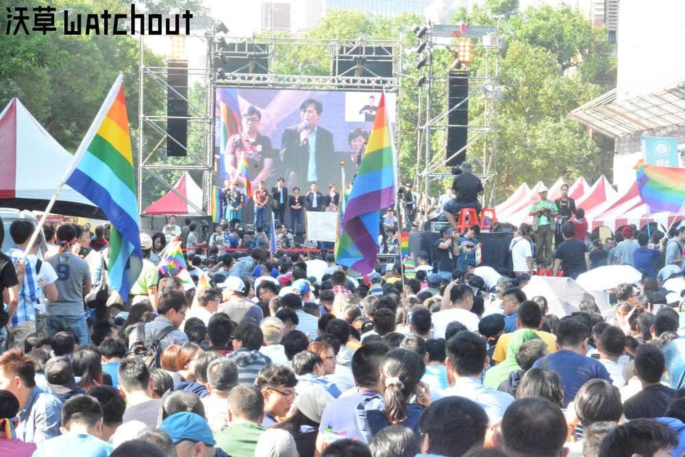 司法法制委員會通過婚姻平權法案初審後,場外挺同婚民眾高聲歡呼,立委尤美女、許毓仁、黃國昌、段宜康等人到集會現場,向群眾致意。(攝影/薛翰駿)