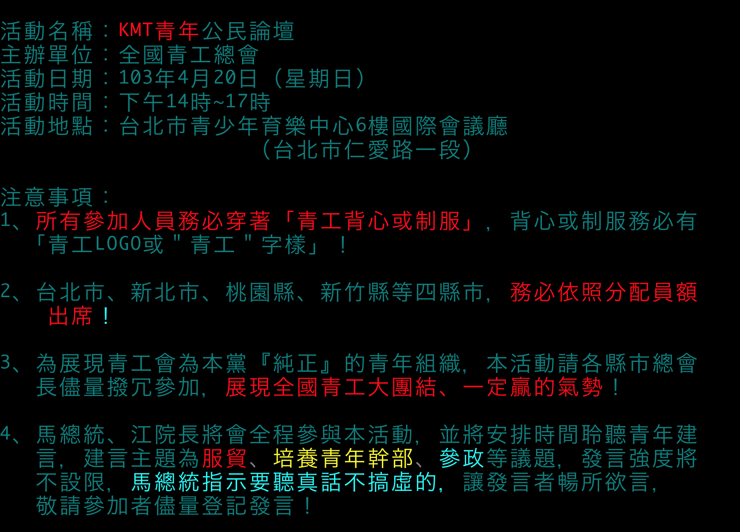 受到太陽花學運的震撼,為挽回年輕人的心,馬政府日前表示將放下身段與青年對話,總統馬英九更宣布,本週日將與行政院長江宜樺親自與青年朋友進行座談。但網友根據國民黨青工總會內部公文表示,週日活動只限小kk,讓人失望,而且「台北市、新北市、桃園縣、新竹縣等四縣市,務必依照分配員額出席」,網友批「這不是動員,甚麼才是動員」,公文還説「馬總統指示要聽真話不搞虛的」,網友說這話聽起來簡直像對岸中國共產黨的宣傳口號,說真話難道還需要公文通知嗎?