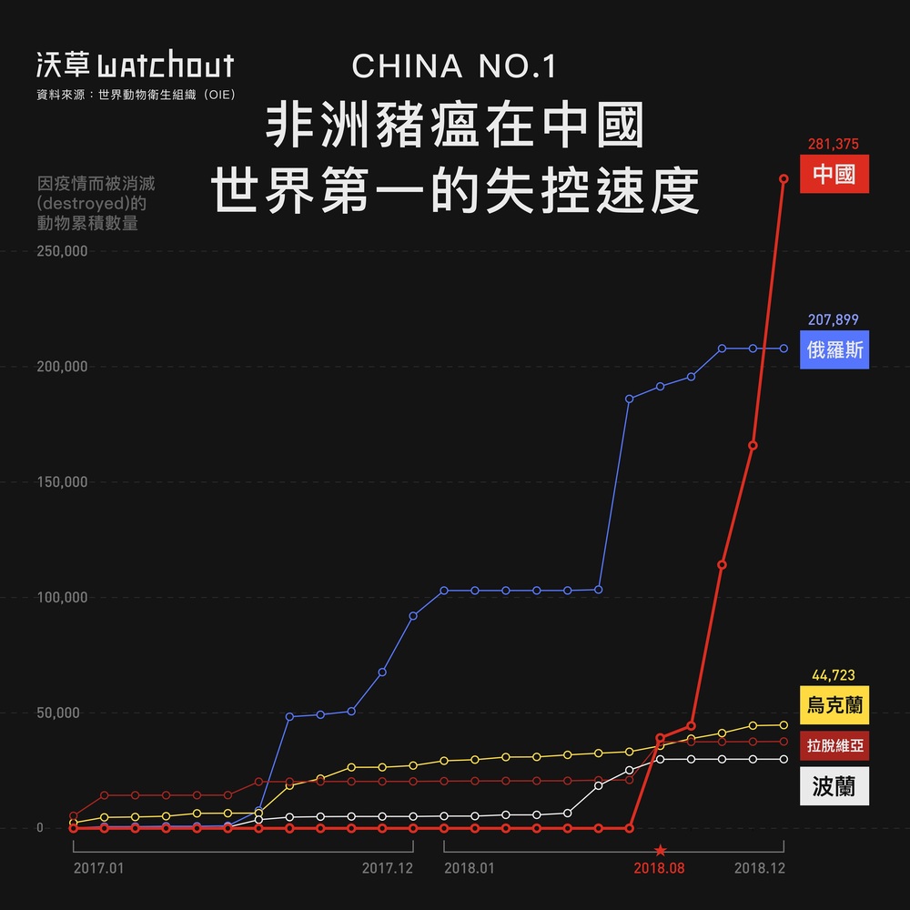 根據 OIE 公布的數據顯示,中國從去年 8 月疫情爆發後,光是第一個月所消滅(Destroyed)的豬隻數量,就高過烏克蘭、拉脫維亞和波蘭等非洲豬瘟疫區國家。《沃草》統計自 2017 年 1 月起的豬隻消滅數量,近年受到非洲豬瘟肆虐的俄羅斯,在 11、12 月就沒有新的消滅案例,其累積消滅數量在今年 12 月份正式被中國超前。中國在短短的五個月內,豬隻累積的消滅數量就超越了這些傳統非洲豬瘟疫區。