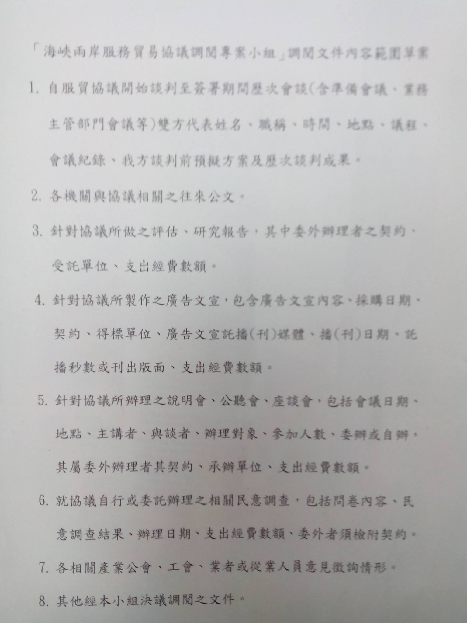 立法院「海峽兩岸服務貿易協議調閱專案小組」決議,向行政院調閱以下七大項內容: