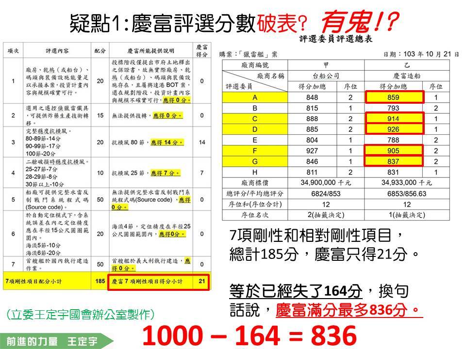 王定宇指出,根據評選分數表,共有7個項目可明確推算得分,例如是否有船塢、不同的抗衡風程度應給予幾分等。而慶富在此7項目內,總分185只得21分,意即最初就損失164分。在總分1000分的評選內,慶富不可能超過836分。但王定宇出具資料質疑,居然有5位委員給了高於836分,最高分甚至達926分。他質問國防部:「這有無問題?」
