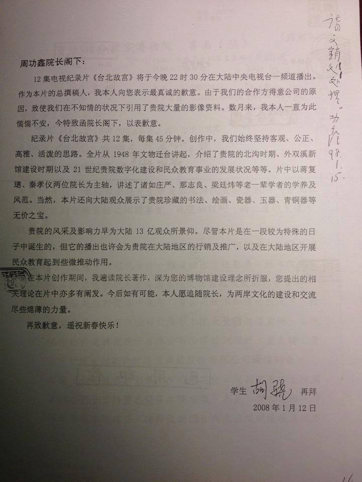 該紀錄片總撰稿人的道歉信函署名日期是2008年1月12日,收件人是「周功鑫院長閣下」,但周功鑫當年5月20日才上任故宮院長,難道央視方面事前便知曉院長人選?又,該道歉信上有「請文銷處處理,功鑫98.1.15」等字樣,當時尚未是院長的周功鑫,為何能有此批示?