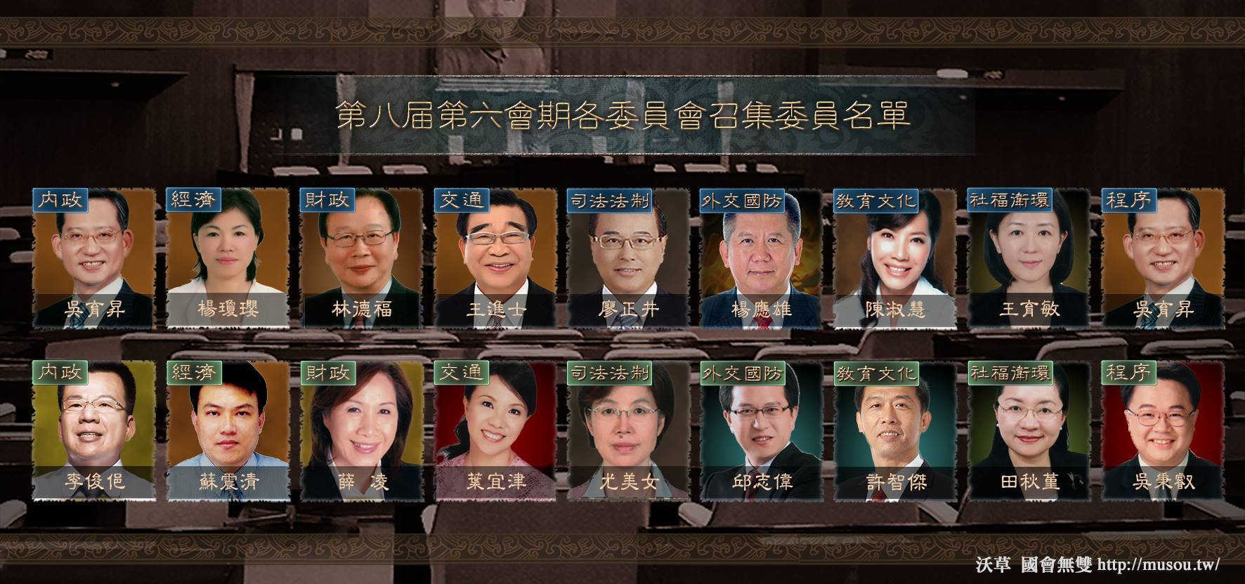 委員會名稱召委一召委二內政吳育昇(國)李俊俋(民)外交及國防楊應雄(國)邱志偉(民)經濟楊瓊瓔(國)蘇震清(民)財政林德福(國)薛凌(民)教育及文化陳淑慧(國)許智傑(民)交通王進士(國)葉宜津(民)司法及法制廖正井(國)尤美女(民)社會福利及衛生環境王育敏(國)田秋堇(民)程序吳育昇(國)吳秉叡(民)
