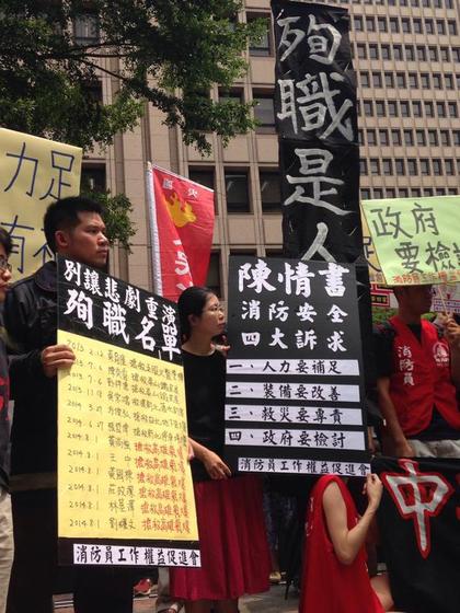圖說:消防員工作權益促進會八月18日於消防署前抗議,提出「補足人力、改善裝備、救災專責分工,以及要求政府對殉職災害與消防體制提出檢討報告」等四項制度訴求。
