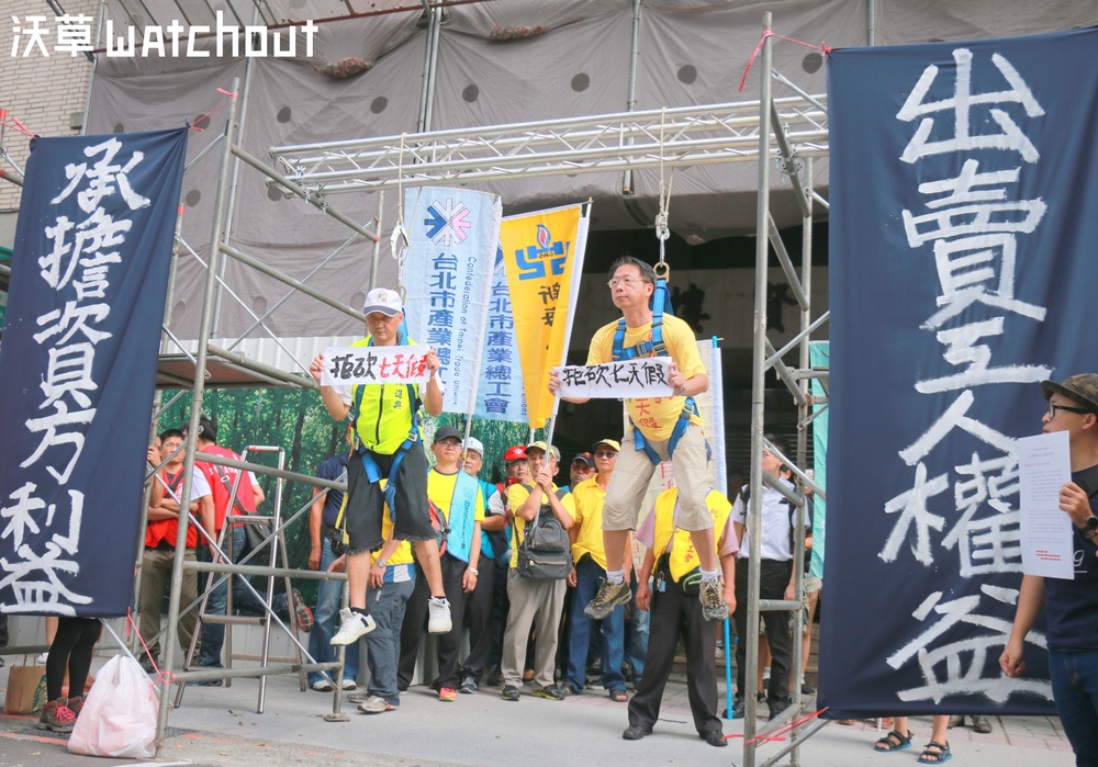 為抗議一例一休《勞基法》修正案,勞工代表手持「拒砍七天假」標語、懸吊在架設於立院群賢樓外的鷹架上,表達勞工「命懸一線」的處境。(攝影/蕭長展)