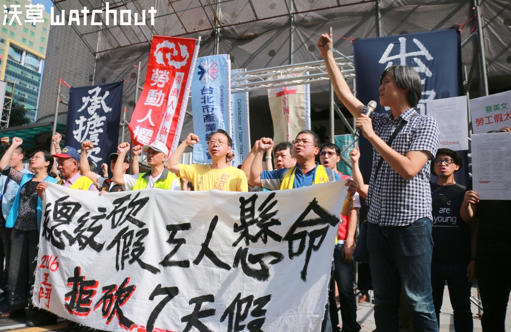 勞工團體聚集於群賢樓外,呼口號痛批一例一休是「承擔資方利益、出賣工人權益」。