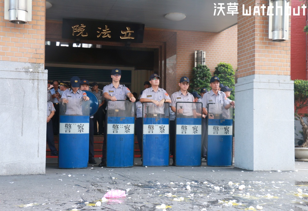 勞團得知一例一休在民進黨團主導下審查通過後,轉往立院大門,丟擲雞蛋表達不滿,現場「蛋」痕累累。
