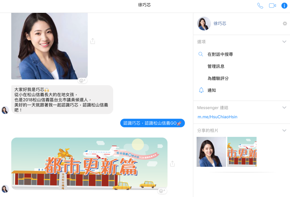 社群網站成為打選戰的武器之一,徐巧芯團隊規劃設計了 Chatbot (聊天機器人),將政見透過故事呈現。(截圖自徐巧芯粉絲專頁)