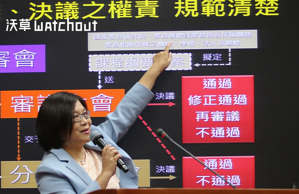 對於潘文忠的說法,近日遭質疑施壓的民進黨立委管碧玲則指出,教育部對於程序的理解錯誤。她以投影片解說,課審會分兩個組織:審議大會與分組審議會。而研修小組的提案與其他任何教育團體所提的提案位階相同,依法需先送審議大會交分組審議會討論。研修小組的草案送交分組審議的結論是不通過,分組審議會送回審議大會的是不超過30%的提案。