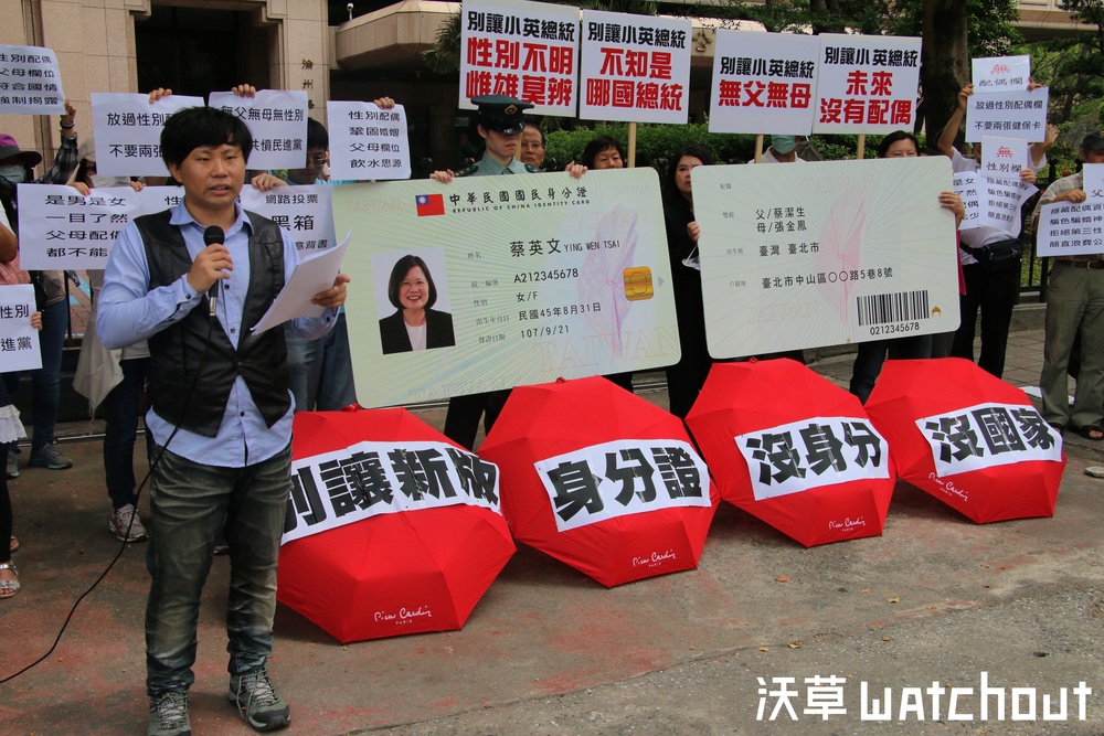 數個民間團體「對策研討會」、高雄市家長聯盟、守護臺灣聯盟等,今日集結約數十名民眾至內政部前抗議新版身分證設計比賽沒有強制揭露性別,配偶等欄位。