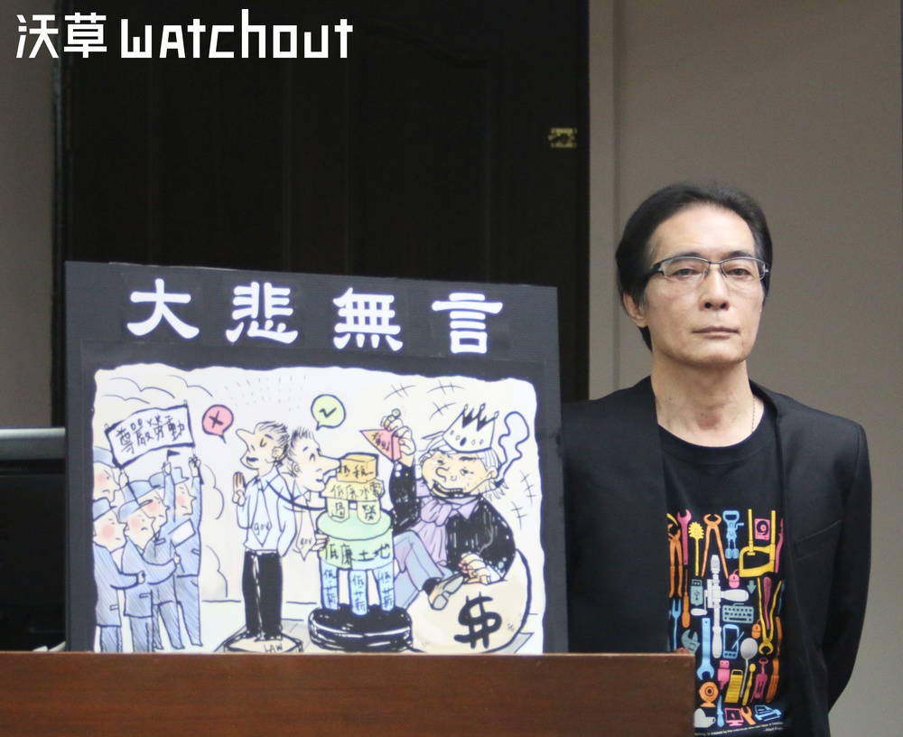 勞工運動出身的民進黨立委鍾孔炤於質詢台放上「大悲無言」立牌,並於質詢時間六分鐘內都保持沈默,以「無言」表達對此次修法的抗議。(攝影/蕭長展)