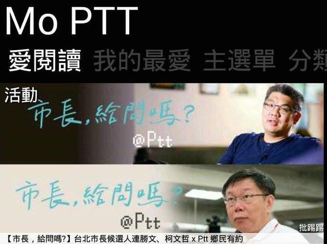 PTT實業坊舉辦的「與鄉民有約」活動,繼日前首波邀請台北市長候選人馮光遠回答網友提問後,連勝文則將於今日晚上九點赴約挑戰。「與鄉民有約」活動中,網友可藉由「」平台提問,最多人連署支持的問題,將會被優先提出、交由市長候選人透過網路直播回答,【沃草】負責這活動的網路提問平台架設,並協助現場直播。另一位市長候選人柯文哲則將在24日上線,回答鄉民提問,目前已開放針對柯文哲的。