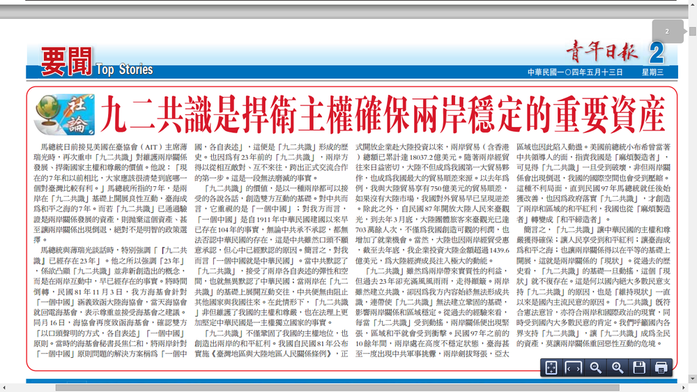 (圖片截自青年日報PDF電子報紙 http://news.gpwb.gov.tw/pdf/20150513.pdf )