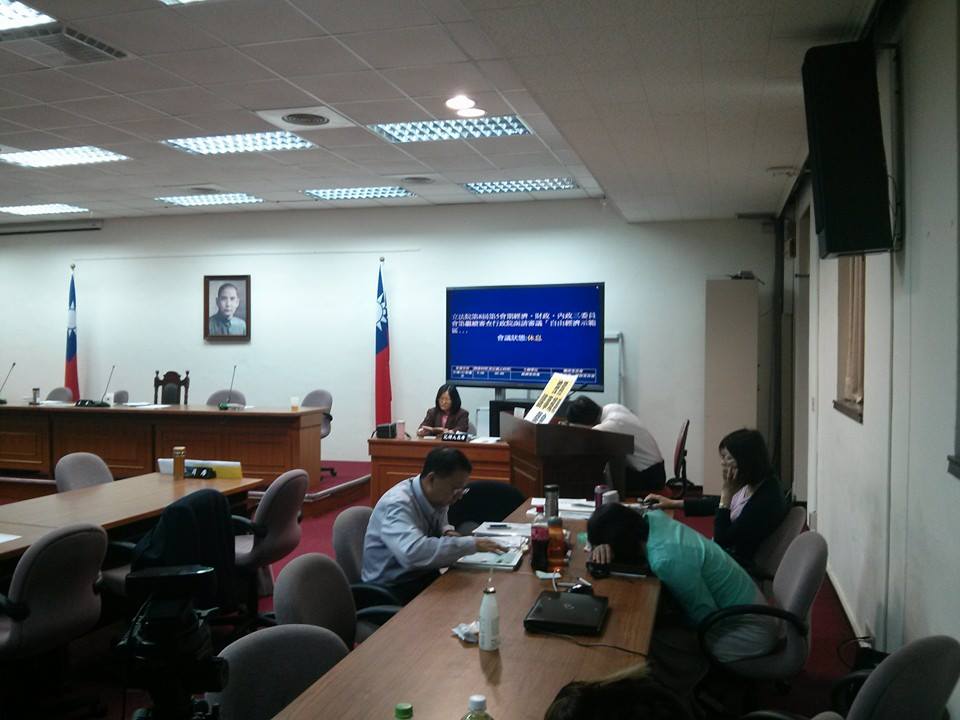 中午休息的時候,所有委員都離開了,只剩下民進黨委員留在議場,吳秉叡則直接趴在發言檯上睡覺。