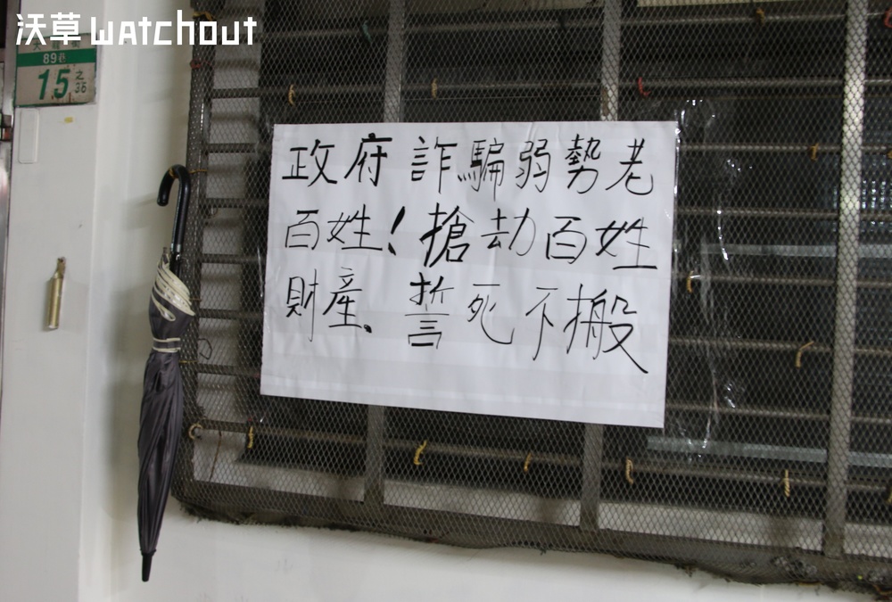內政部表示新《都更條例》能有效減少「釘子戶」。圖為近日臺北斯文里公辦都更不同意戶的抗議標語。(攝影/廖昱涵)