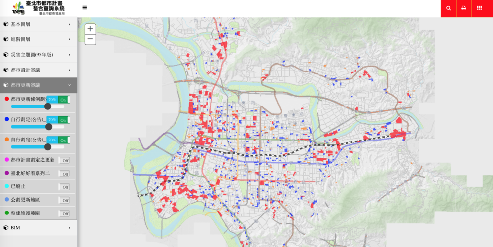 以北市為例,徐亦甫質疑自劃更新單元(藍、橘點)沒有內政部所言分散、孤立,也看不出與都更區(紅點)的區別,根本是政府怠於劃定。(截圖自臺北市都計整合查詢系統)