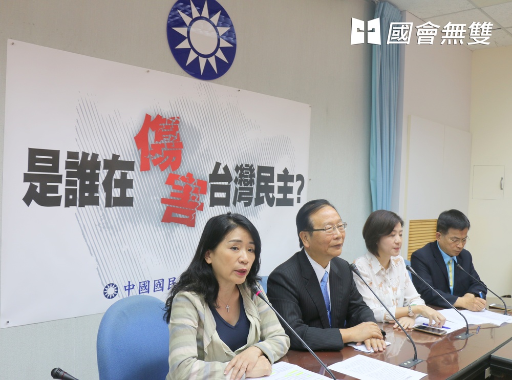 國民黨團副書記長王育敏(右三)抨擊,民進黨因顧慮馬英九到立院國情報告創下先例,日後蔡英文當選將吃不消,因此拒絕國民黨公開透明邀請馬英九到立院報告的提案。(攝影/蕭長展)