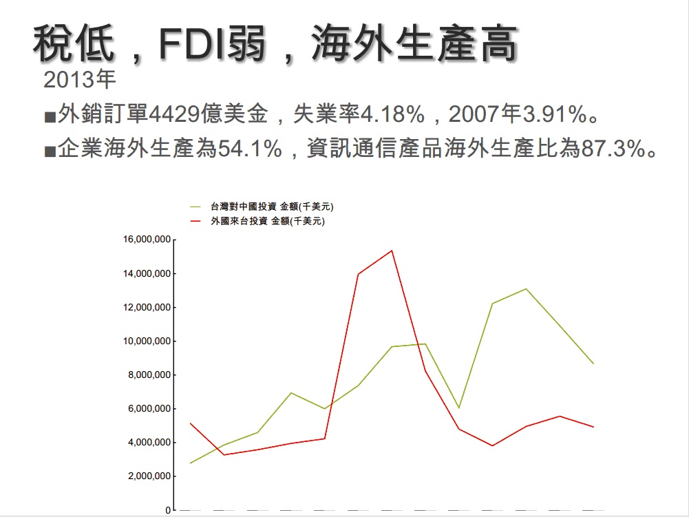 根據附表,台灣的租稅減免大量集中在製造業,「但現在台灣廠商的生產線多數外移,減稅並沒有回饋到勞工身上。」洪敬舒指出,台灣2013年外銷訂單4,429億美元,創下歷史新高,但是失業率並沒有下降,企業海外生產比例為54.1%,資通訊產品海外生產比,更高達87.3%,「台灣的營利事業所得稅從25%降調17%,卻沒有達成招商、產業升級的效果,如果這樣大減稅沒有用,自經區又能創造多少『不會在台灣發生的商業活動』?」