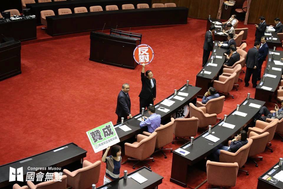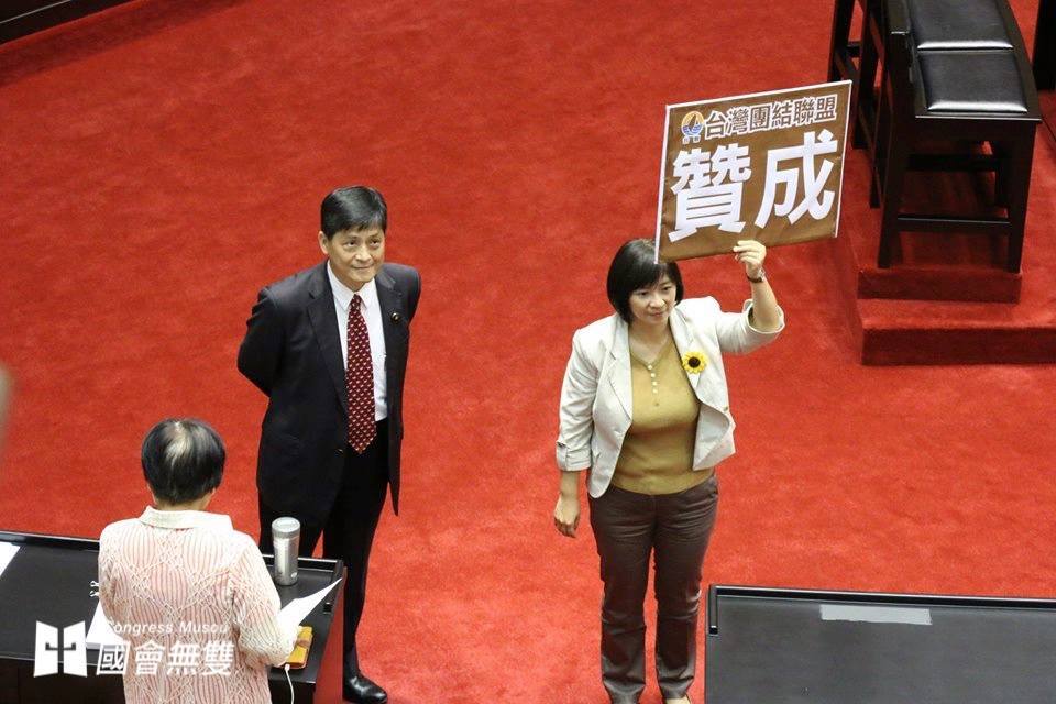 台聯立委周倪安於表決時手持「贊成」牌,表達黨團支持自身「變更議程」提案的立場。(攝影:蕭長展)