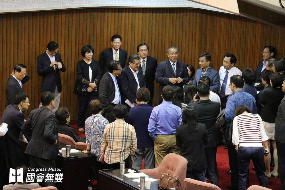 國民黨團於立院副院長洪秀柱宣布休息用餐後,聚於議場旁「開會」。(攝影:蕭長展)
