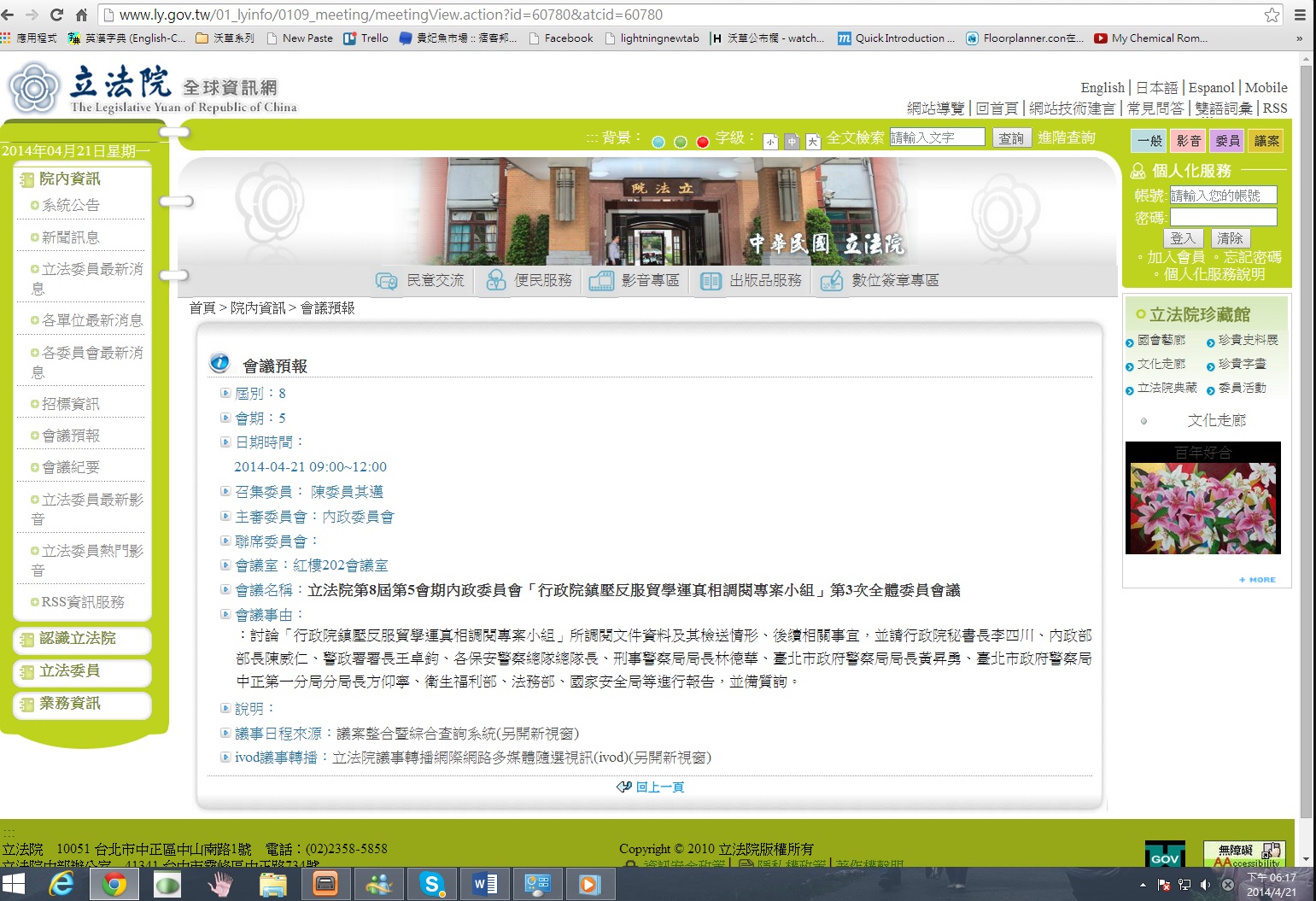 今日上午9時起,立法院內政委員會召開「行政院鎮壓反服貿學運真相調閱專案小組」第3次全體委員會議,討論「行政院鎮壓反服貿學運真相調閱專案小組」所調閱文件資料,及其檢送情形、後續相關事宜。行政院秘書長李四川、內政部部長陳威仁、警政署署長王卓鈞、各保安警察總隊總隊長、刑事警察局局長林德華、臺北市政府警察局局長黃昇勇、臺北市政府警察局中正第一分局分局長方仰寧、衛生福利部、法務部、國家安全局等進行報告,並備質詢。