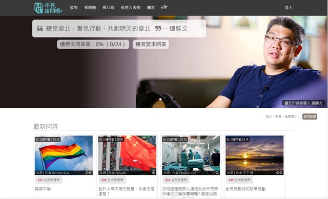 連勝文的競選團隊近日在網路上風波不斷,除了競選總幹事蔡正元批評柯文哲的「三假哲伯格症」風波外、日前某支競選短片也被抨擊「權貴生活、不知民間疾苦」,讓他飽受委屈。沃草「市長,給問嗎?」市民提問平台,透過民眾提問、聯署達標後,候選人回答的機制,讓候選人能夠清楚得知選民關心的議題,並完整表達自己意見。透過第三方中立平台,過程中候選人發言不會被斷章取義,選民也可透過平台與候選人對話,創造選民、候選人雙向溝通的通暢管道。