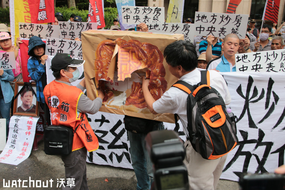 今(20)日上午,惜根台灣協會、反迫遷連線、台灣人權促進會、經濟民主連合等團體,在內政部大樓前,抗議新政府上台後,包括橫跨新北市新莊、泰山地區的塭仔圳市地重劃以及高雄果菜市場等拆遷案。惜根台灣協會理事長、政大地政系教授徐世榮(上圖右)以及塭仔圳居民代表,以民間故事為發想,擊破月餅道具,取出其中寫著「九二五,上凱道」的布條,象徵「革命的信號」,預告將在本月25日集結各個迫遷受害團體,上凱道爭取土地正義。徐世榮說,蔡英文選前宣稱要改變,選後卻跟劉政鴻等人一樣說依法行政,「蔡英文是個雙面人」!人權公約施行監督聯盟召集人、總統府人權諮詢委員黃嵩立也表示,「依法行政」原本的用意是要限制政府權力,而不應該用來限制人民。(圖與文/何宇軒)