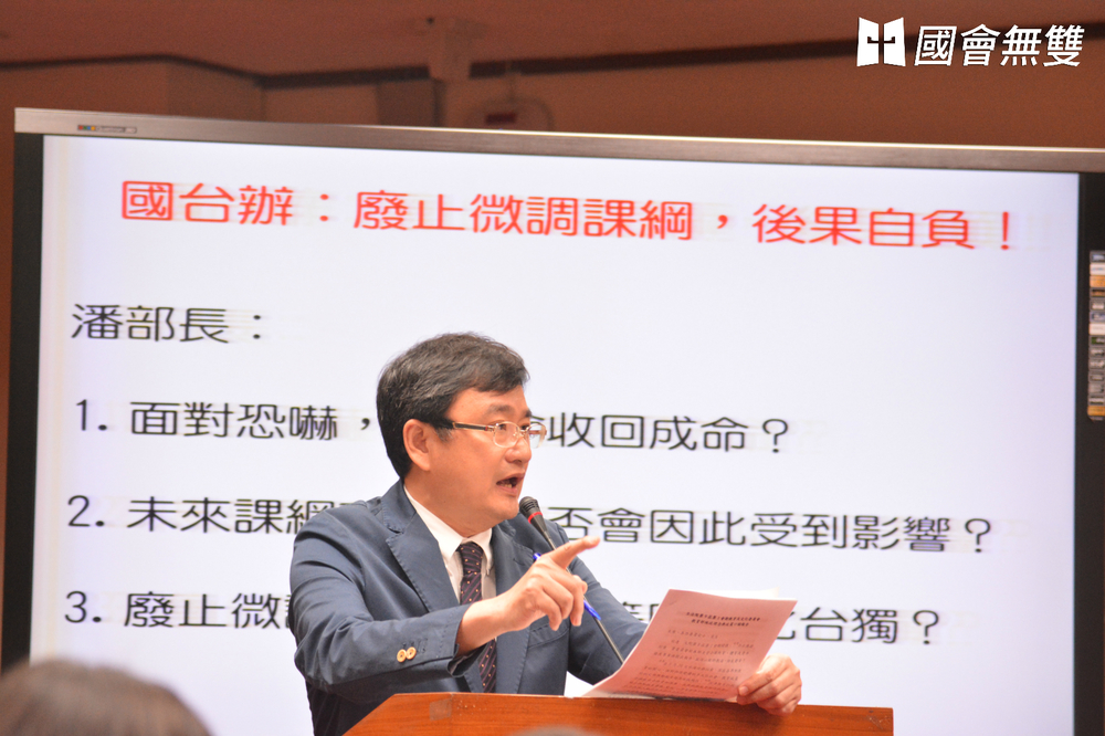 新任教育部長潘文忠今(30)日首次到立法院進行業務報告,多位立委都就微調課綱問題進行質詢,民進黨立委黃國書質疑,中共國台辦(國務院臺灣事務辦公室)說新政府撤銷微調課綱「後果自負」,他無法接受國台辦對臺灣的政策指指點點,除非國台辦派人來臺灣選立委,否則「它憑什麼?」。時代力量立委黃國昌則要求潘文忠必須追究當初胡搞瞎搞弄微調課綱的人,他也指出現在已經有白紙黑字的資料被公開,說明微調課綱背後有中共統戰的黑手,一定要釐清是誰在主導、並追究責任,以避免類似事件再發生。