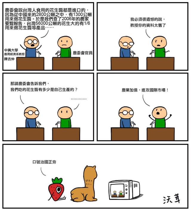 話鋒一轉,陳吉仲以農業為主軸,批評政府自經區政策草率。他認為,政府在自經區中設定所謂「農業加值區」,強調將創造農業相關產業生產、加工、行銷的三贏,並為貿易自由化做準備,但 FTA至少會依照產品性質設定不同的零關稅年限,自經區條例卻讓所有產品直接降至零關稅,國內農業完全沒有調適時間。陳吉仲進一步以花生為例,解析自經區帶來的農業衝擊。他表示,台灣每年生產5萬多公噸的花生,其中有六分之一用來製作花生醬,目前台灣市售的花生醬有80%是用台灣花生製作,但自經區開放後,便宜的中國花生將直攻台灣花生市場。