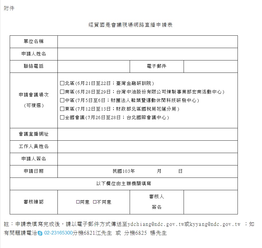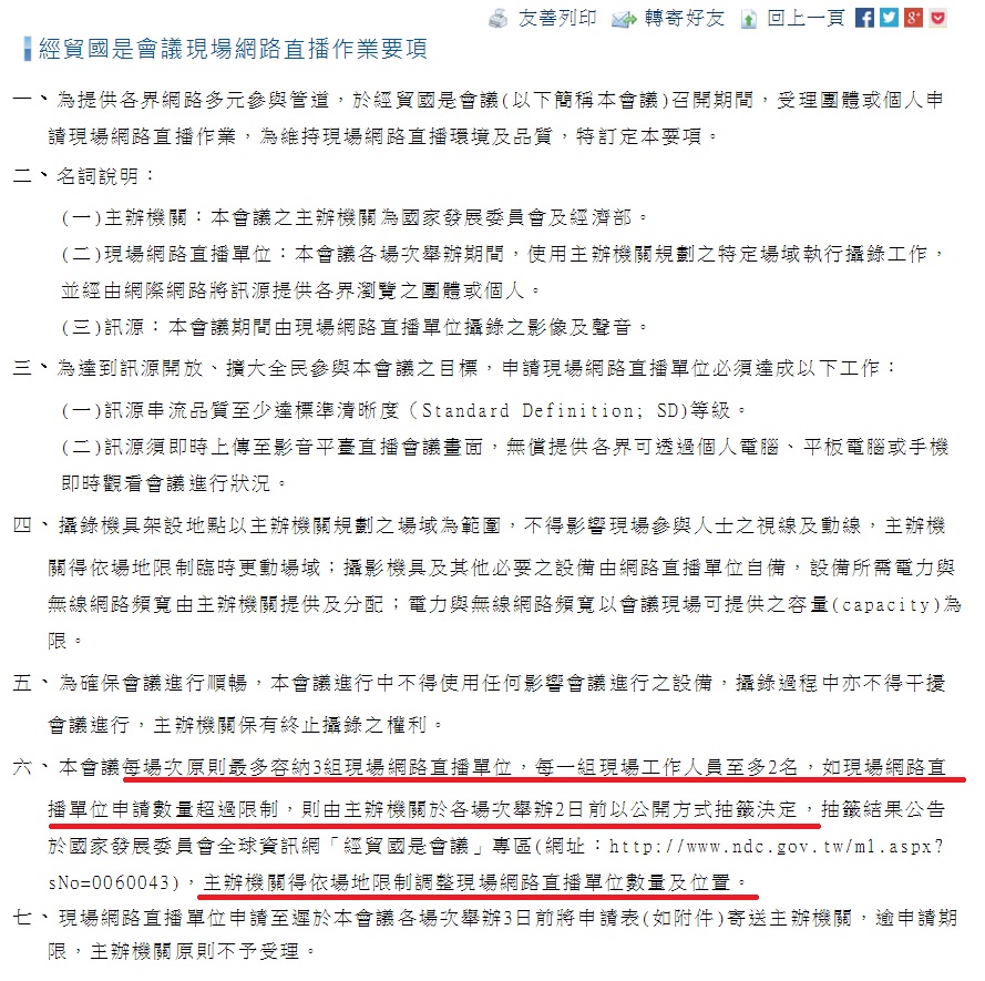 在該作業要項指出,為維持現場網路直播環境及品質,受理團體或個人申請現場網路直播作業。該作業要項還指出,「會議每場次原則最多容納3組現場網路直播單位,每一組現場工作人員至多2名,如現場網路直播單位申請數量超過限制,則由主辦機關於各場次舉辦2日前以公開方式抽籤決定。」提供申請表單供公民記者填寫,但下方卻有「審核確認」的欄位。