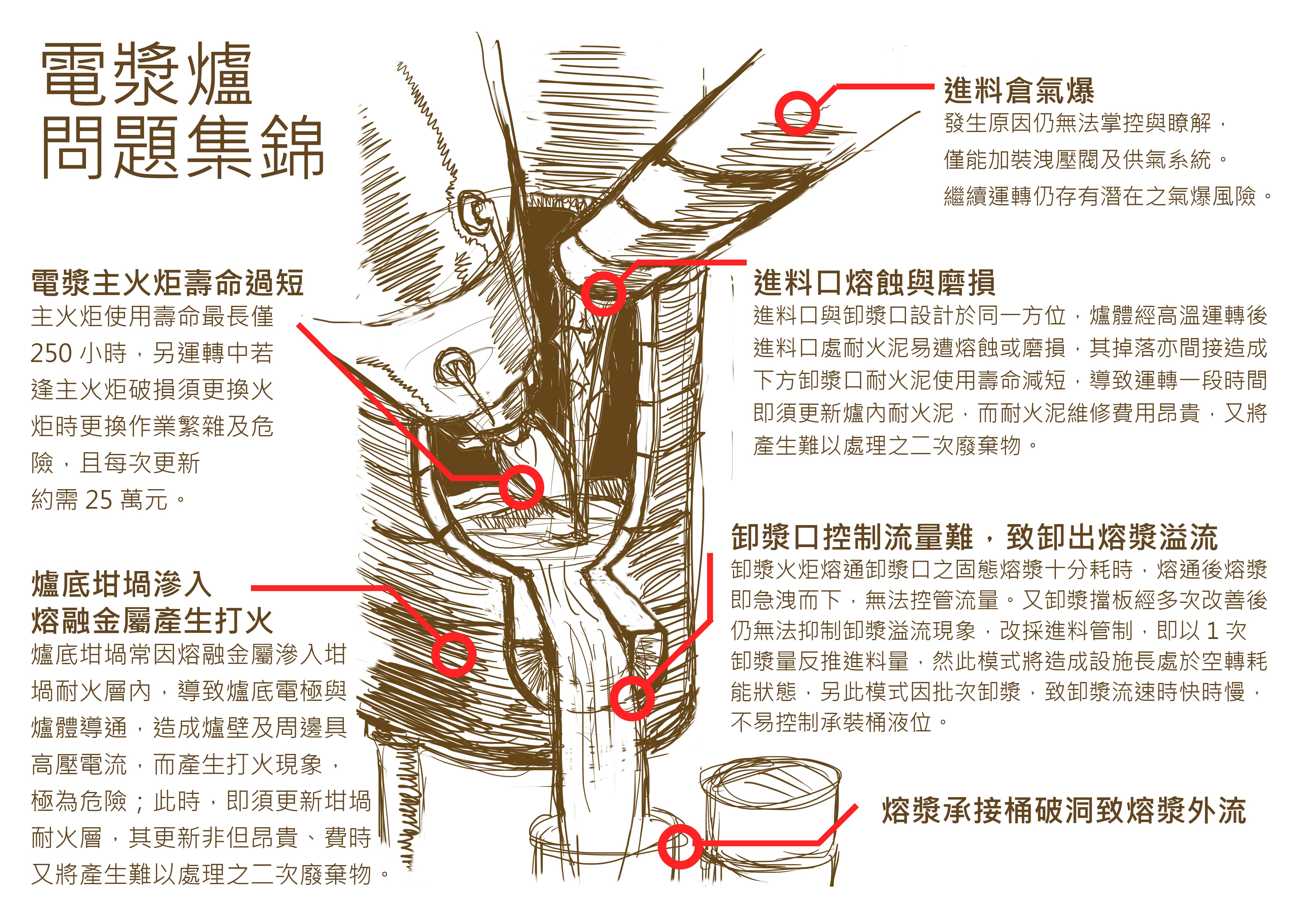 - 電漿主火炬使用壽命過短(使用壽命最長僅約為 250 小時,且更換耗時費日、每次更新需25萬元。)