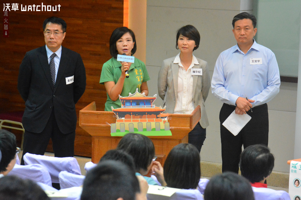 (台南五位區域立委中除林俊憲外都出席參加沃草與台南新芽合辦的「台南立委給問嗎?」。左起民進黨立委黃偉哲、葉宜津、陳亭妃及王定宇。薛翰駿/攝影)