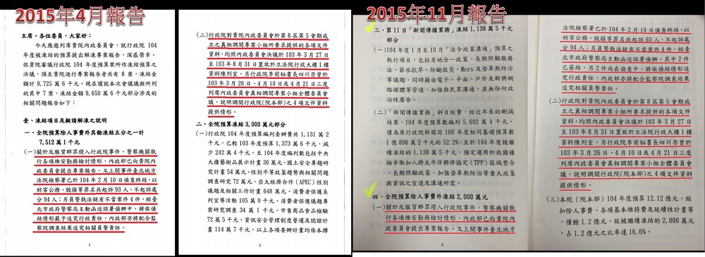行政院為解凍因「三二四」事件遭凍結的二千萬元預算,分別在今年四月及十一月提出報告,今日遭民進黨立委陳其邁踢爆根本「一模一樣」。(圖片來源:陳其邁委員辦公室)
