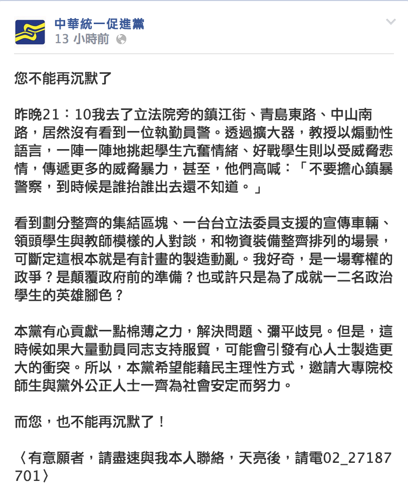前晚中華統一促進黨的Facebook也發出聲明,但內文卻盡是抹黑和栽贓。內文寫「看到劃分整齊的集結區塊、一台台立法委員支援的宣傳車輛、領頭學生與教師模樣的人對談,和物資裝備整齊排列的場景,可斷定這根本就是有計畫的製造動亂。」但事實上,在剛開始幾天,現場跟本沒有立法委員的宣傳車輛,領頭的本來就是學生和黃國昌、賴中強等學者。物資裝備也是在現場志工的努力下才排列整齊的,結果整齊的物資反而被說是「有計畫的製造動亂」。文中還指控現場學生高喊:「不要擔心鎮暴警察,到時候是誰抬誰出去還不知道。」,但事實上學生根本沒有這樣喊過。他們只有喊「警察退後」、「警察不動,我們不動」。若現場有推擠,糾察志工還會帶著大家喊「和平、坐下」,避免群眾和警察發生衝突。這些群眾為了避免警察攻堅,都待在立法院周圍,根本不會去外面飆車滋事。