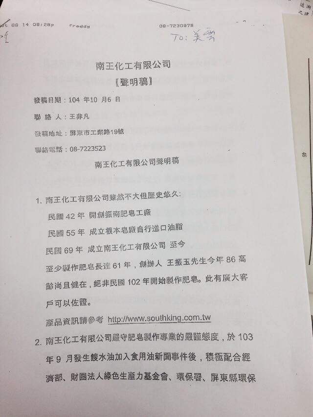 食安問題野火遼原,食藥署代理署長姜郁美今(13)日晚間、於立法院社福衛環委員會接受質詢時承認,食藥署將南王化工所提供的聲明稿,作為食藥署稽查報告發給立法委員。立委田秋堇指出,食藥署於10月6日至南王化工進行稽查已過了一週,至今連份書面報告都交不出來,甚至還替廠商發聲明稿,她強烈質疑,難道食藥署是廠商養的「細漢」嗎?立委管碧玲則表示,食藥署完全搞錯自身與廠商間的關係。