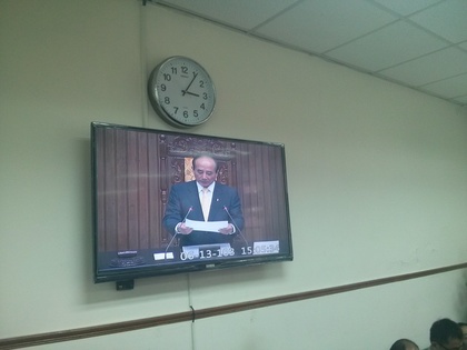 圖說:下午當公督盟人員到場時,立法院議事人員表示,議場內正在表決,無法入場旁聽,並打開會客室內的電視,表示「你們在這裡看轉播也是一樣的」。