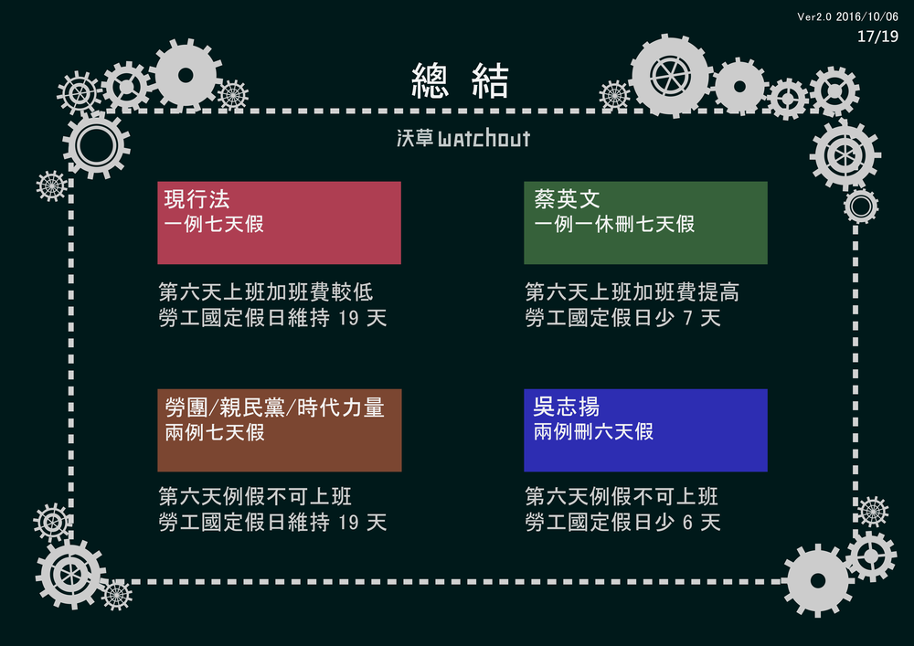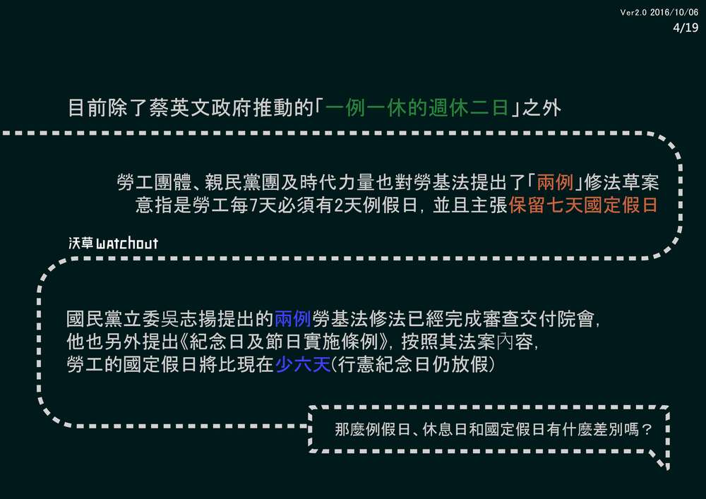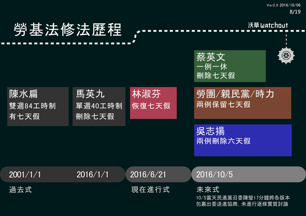 其實,10/5當天送出的勞基法修正案不只有蔡英文政府提出的版本,還有親民黨團及時代力量的各自提出的版本,在更之前還有中國國民黨立委吳志揚提出的草案已經完成審查,這些版本與現行法實質的內容到底是什麼呢?和七天假日又有什麼關係?