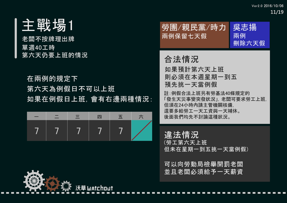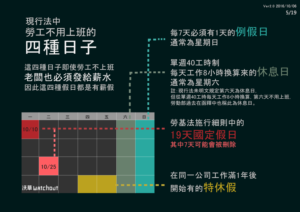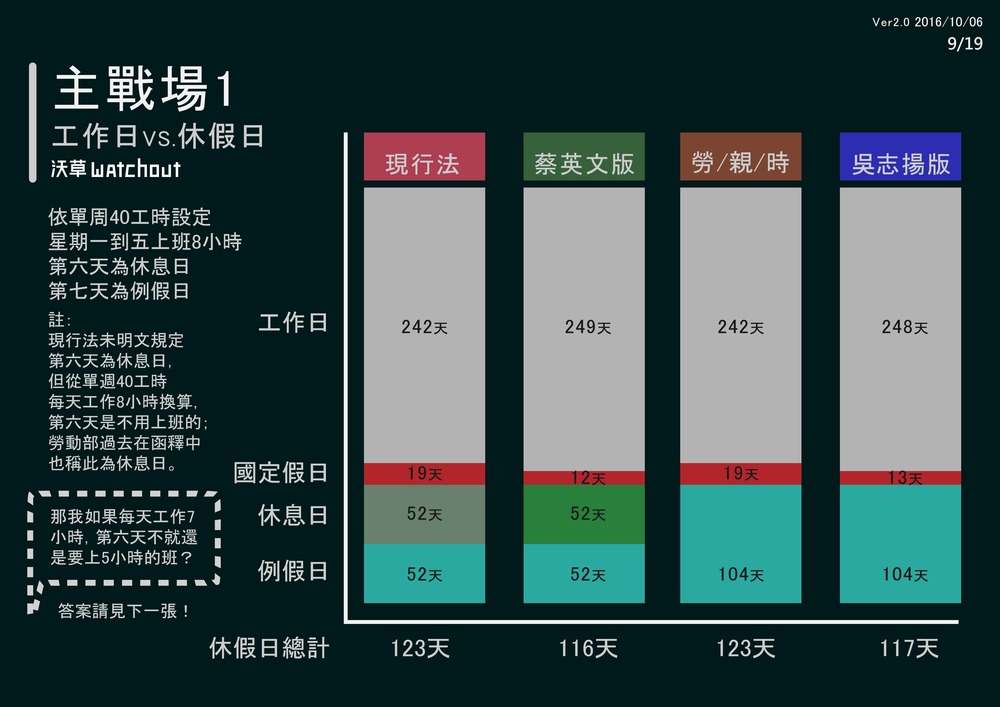 *有關現行法律狀態勞工有123天休假:過去馬英九政府勞動部長陳雄文、現在蔡英文政府勞動部長郭芳煜都多次提到,在過去84工時+19天假的法律狀態,勞工一年休假有110天假,而40工時+刪除7天假的法律狀態則有116天,並以此為豪,主張勞工將多6天假。在現行40工時+19天假的法律狀態下,陳述勞工一年有123天假,是符合勞動法學論文、政府涵釋及新舊政府兩位勞動部長解釋的說法。