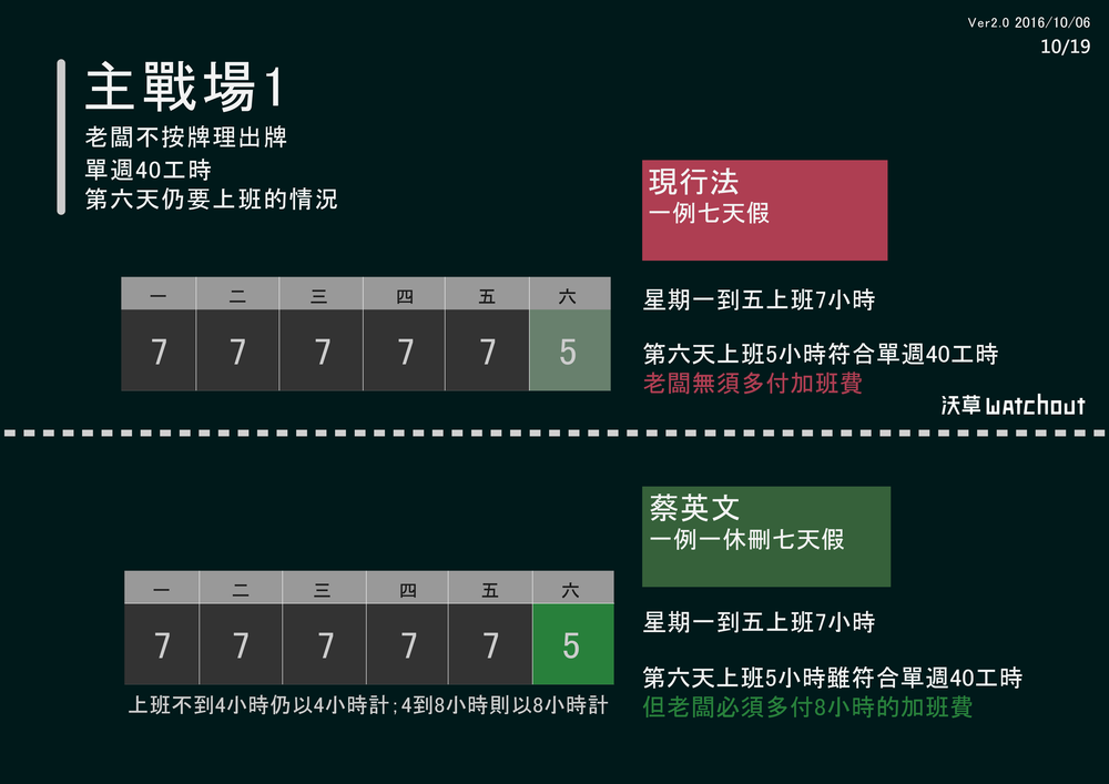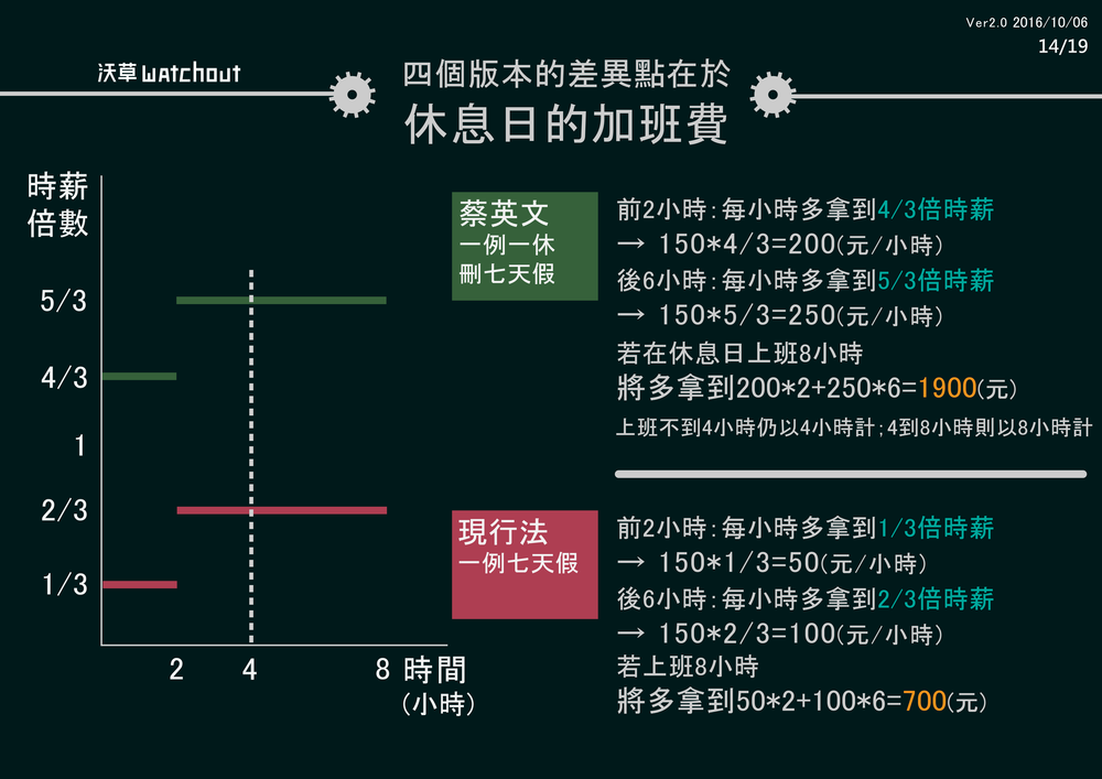 *有關休息日:現行的勞基法中沒有休息日一詞,但在過去雙週84工時有39天無須出勤的日子,目前單週40工時下有52天,勞動法相關論文、勞動部涵釋及政府機關公告都稱之為休息日,並非是蔡英文政府此次修法才出現的名詞。如圖解說明,蔡英文政府的版本除了將這52天明文入法外,也規定提高這52天勞工出勤雇主要付出的成本。