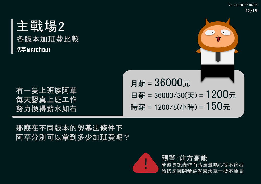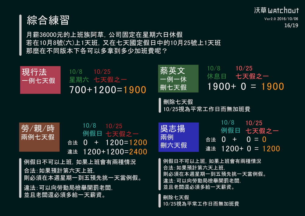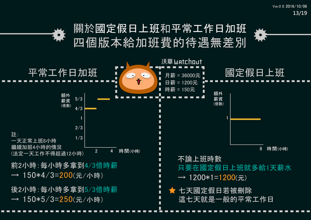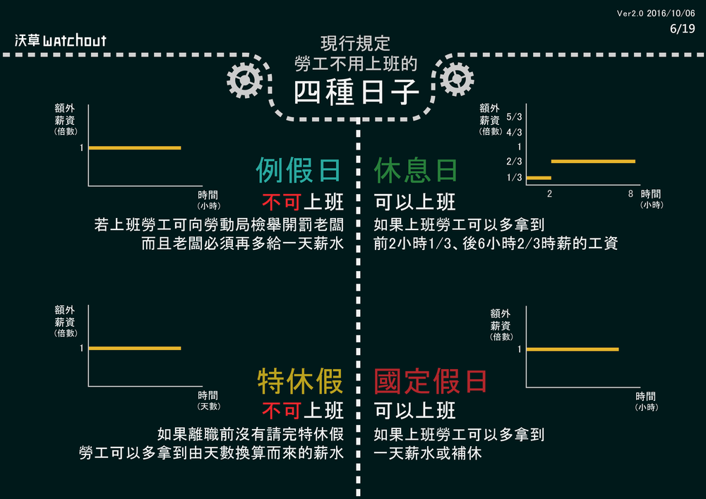 *有關現行休息日的加班費計算:有些勞團認為按照現行的法律規定就應該多給4/3與5/3,而非勞動部解釋的多給1/3與2/3。實務上很多老闆若要求勞工休息日出勤,也會優於法令,比照國定假日出勤,多給勞工一天的薪資而不是只給1/3與2/3,否則可能請不到人。但我們要呈現的是現行法律狀態,必須以勞動部對現行法律的解釋為依據。