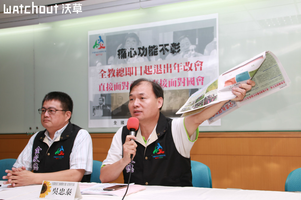 全教總表示長期遭到外界抹黑,將退出年金改革委員會,在立法院推動自己的改革版本。左起:張旭政、吳忠泰。(攝影/何宇軒)