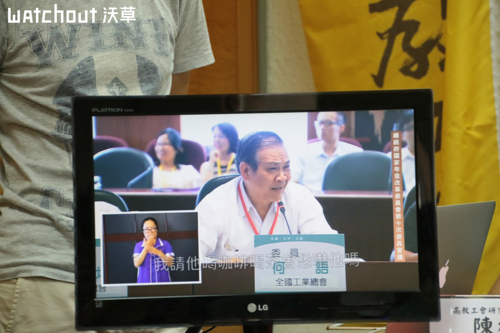 高教工會播出何語在年金改革委員會中,宣稱要請劉侑學「喝咖啡」的發言。(攝影/何宇軒)